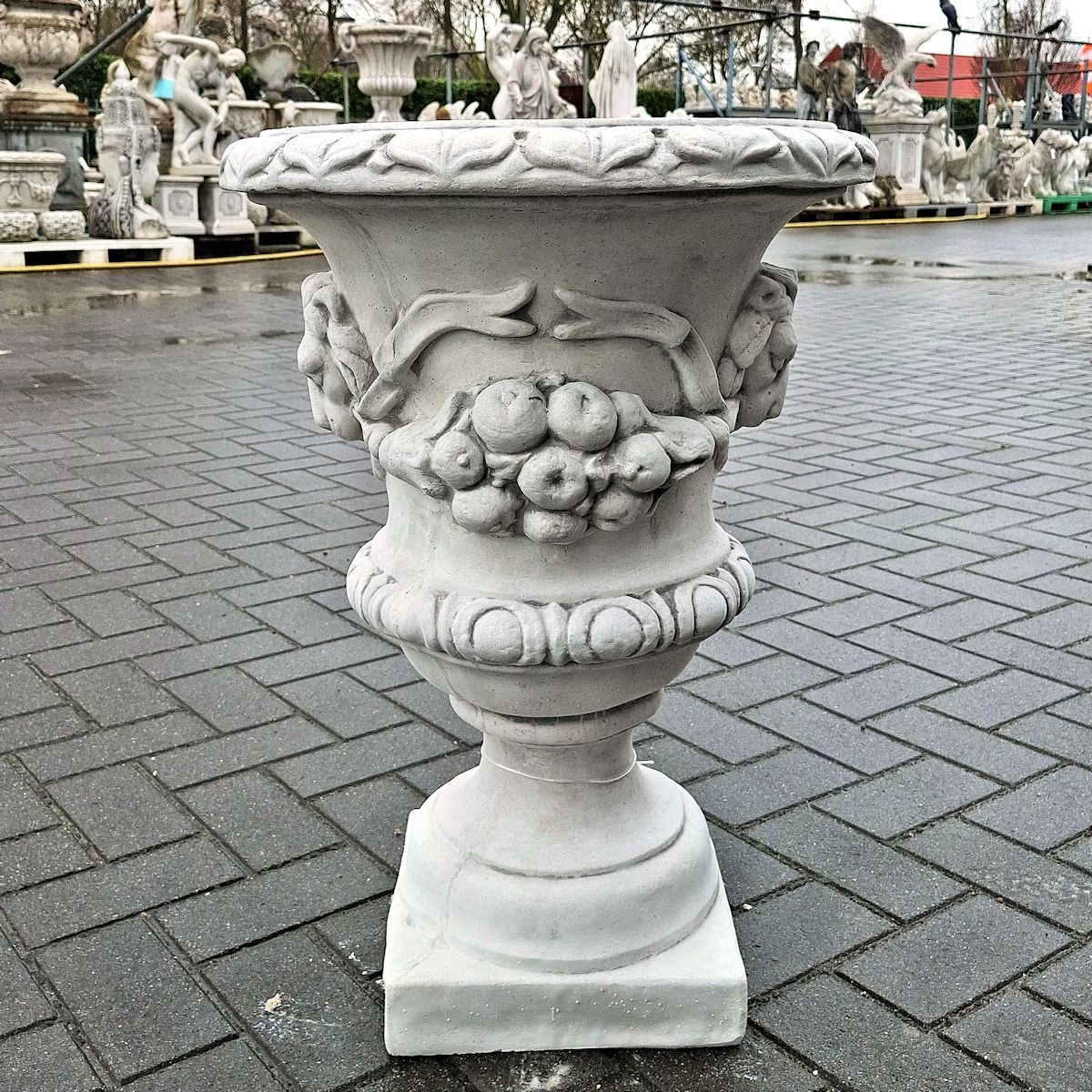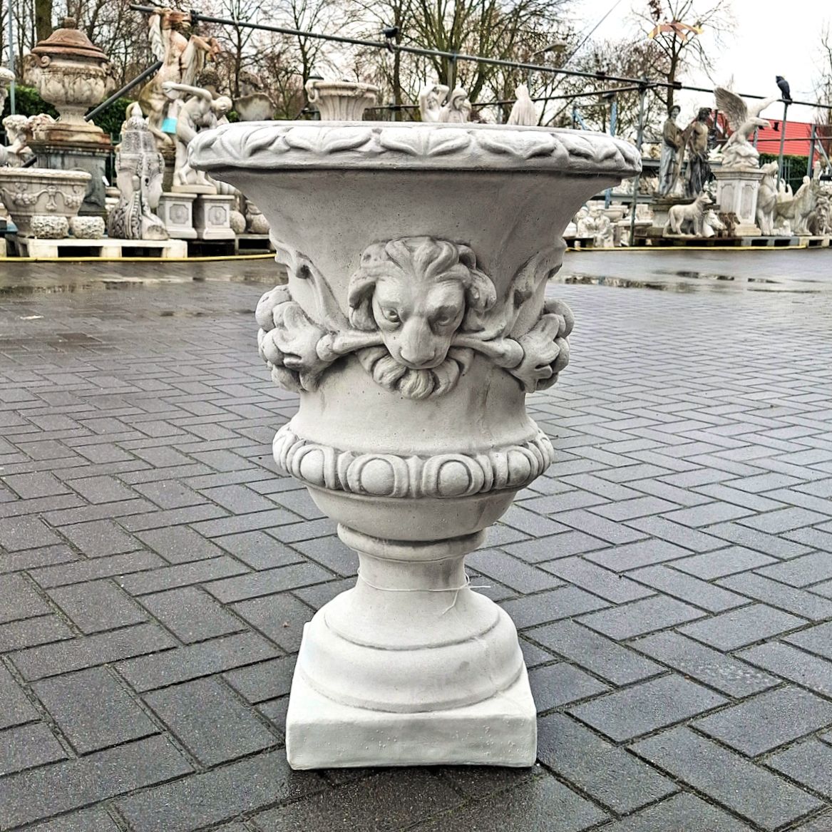 Dekorative Vase mit Löwenköpfen und Früchten als Detail. Klassischer Massivbeton-Gartenvase. (€180,- p/st.)