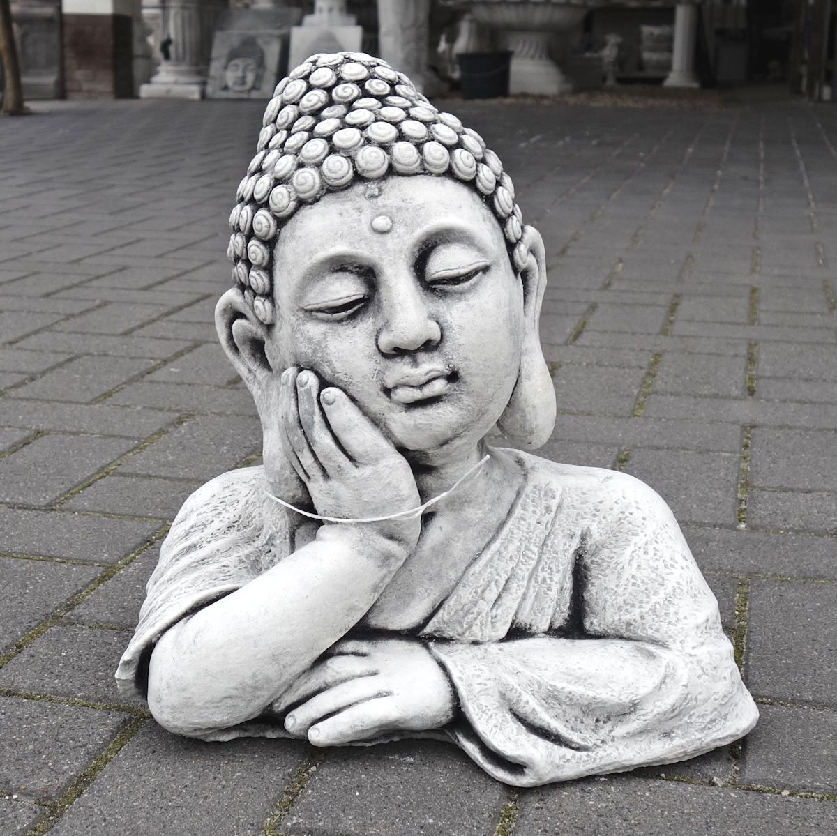 Dit prachtige betonnen Boeddha beeld straalt een intense sereniteit en stilte uit, perfect om een plek van bezinning en kalmte te creëren in uw tuin, op het balkon of het terras. Het beeld toont het hoofd van de Boeddha in een rustende, meditatieve houding, waarbij de hand zachtjes tegen de wang rust – een gebaar dat diepe reflectie en vrede symboliseert. Gemaakt van massief beton, is dit beeld ontworpen om de elementen te weerstaan en vormt het een duurzame en stabiele aanwinst. Met zijn bescheiden maar sprekende afmetingen van circa 35 cm hoog en 32 cm breed en een gewicht van circa 18 kg, is dit Boeddhabeeld gemakkelijk te plaatsen tussen planten, bij een vijver of op een sokkel. De neutrale grijze tint van het beton zorgt voor een tijdloze en rustgevende uitstraling die in elke tuinstijl past. Creëer uw eigen oase van rust en bestel dit serene betonnen Boeddha beeld vandaag nog! Prijs €75,-.