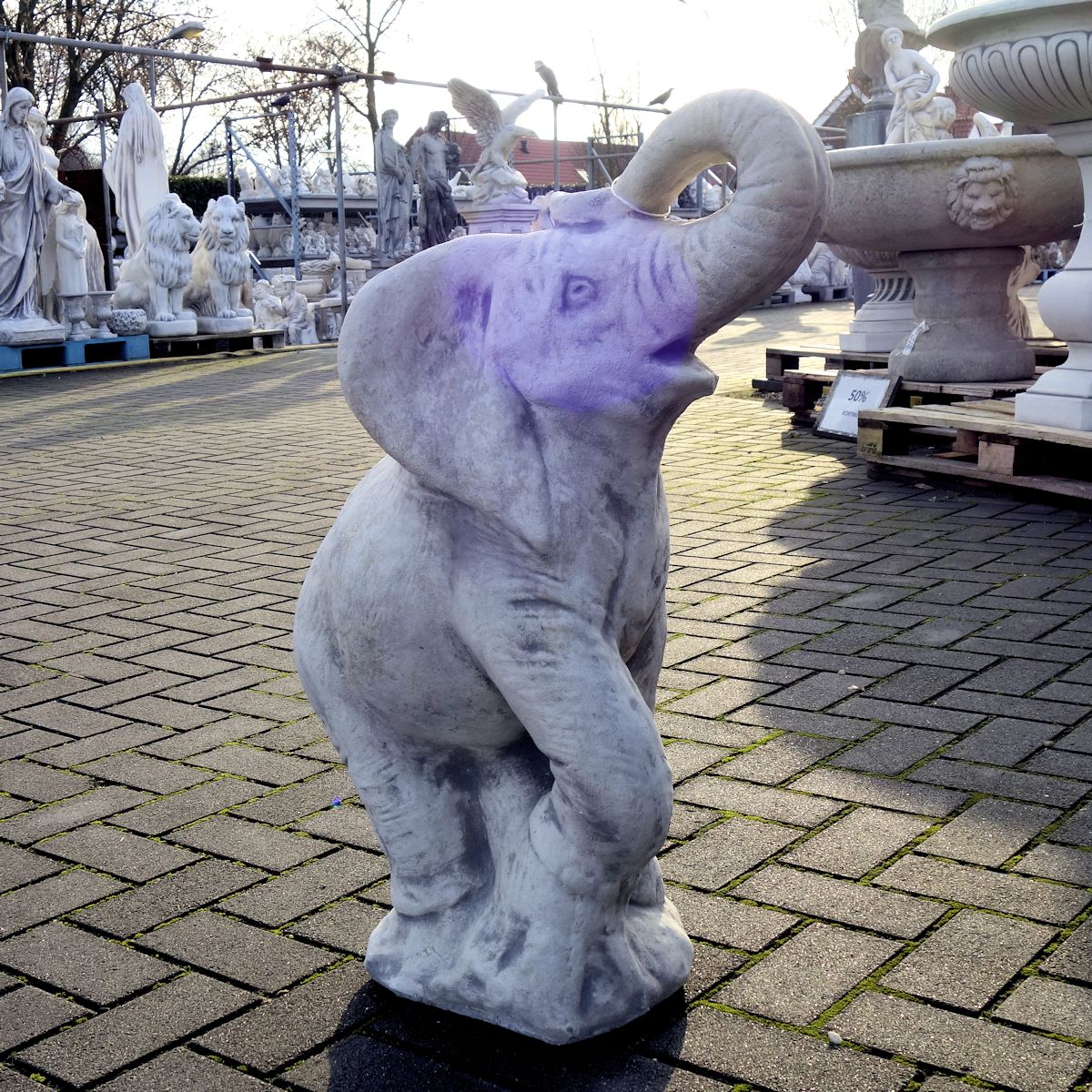 Breng stijl en kracht in uw tuin met deze betonnen olifant. Met een hoogte van 75 cm, lengte 48 cm en breedte 29 cm is dit grote, zware tuinbeeld (ca. 60 kg) een opvallend en stabiel decoratief element. Perfect voor zowel klassieke als moderne tuinen. Prijs €120,-.